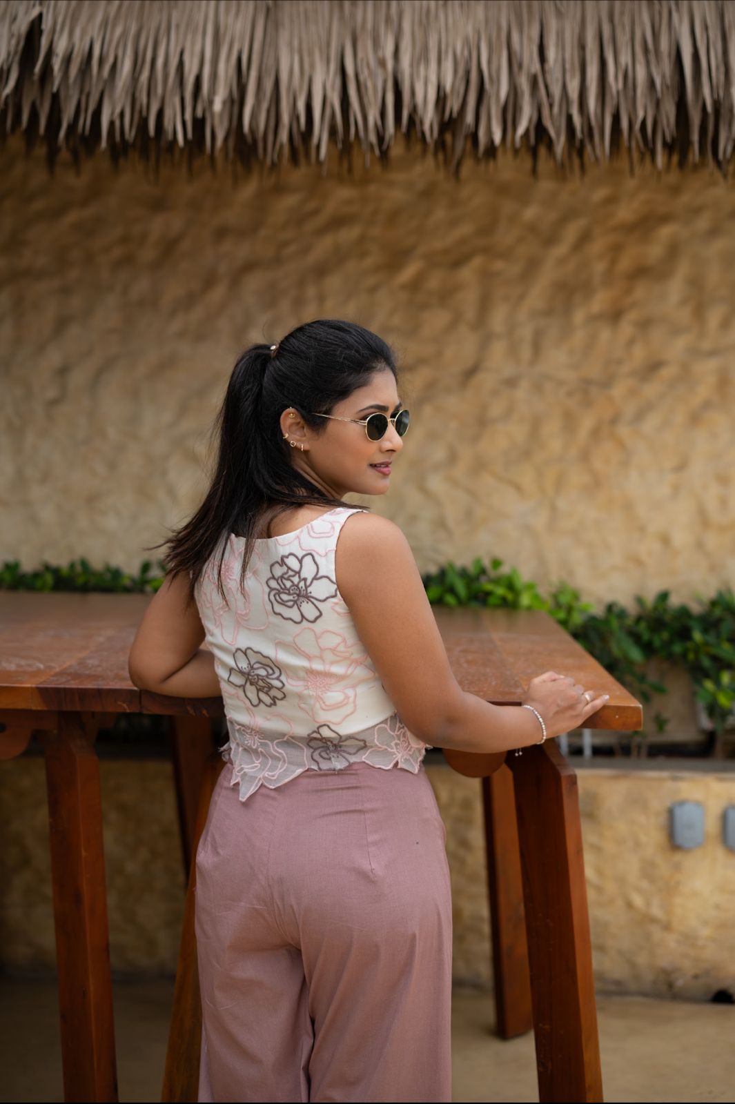 Effortlessly powerful β this onion pink co-ord set features a floral embroidered crop top with scalloped edges and wide-leg pants that command the room. Soft, structured, and full of presence.
