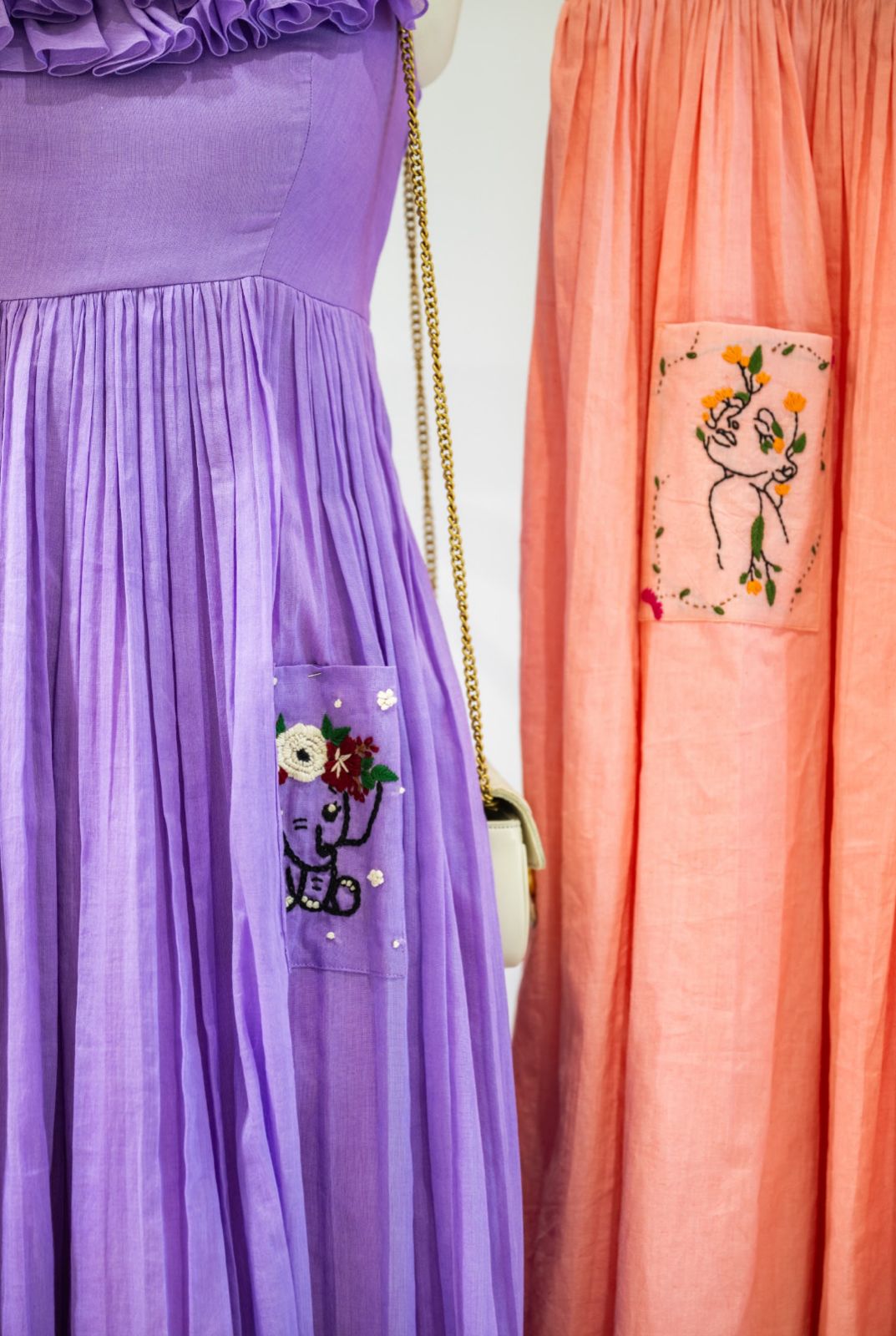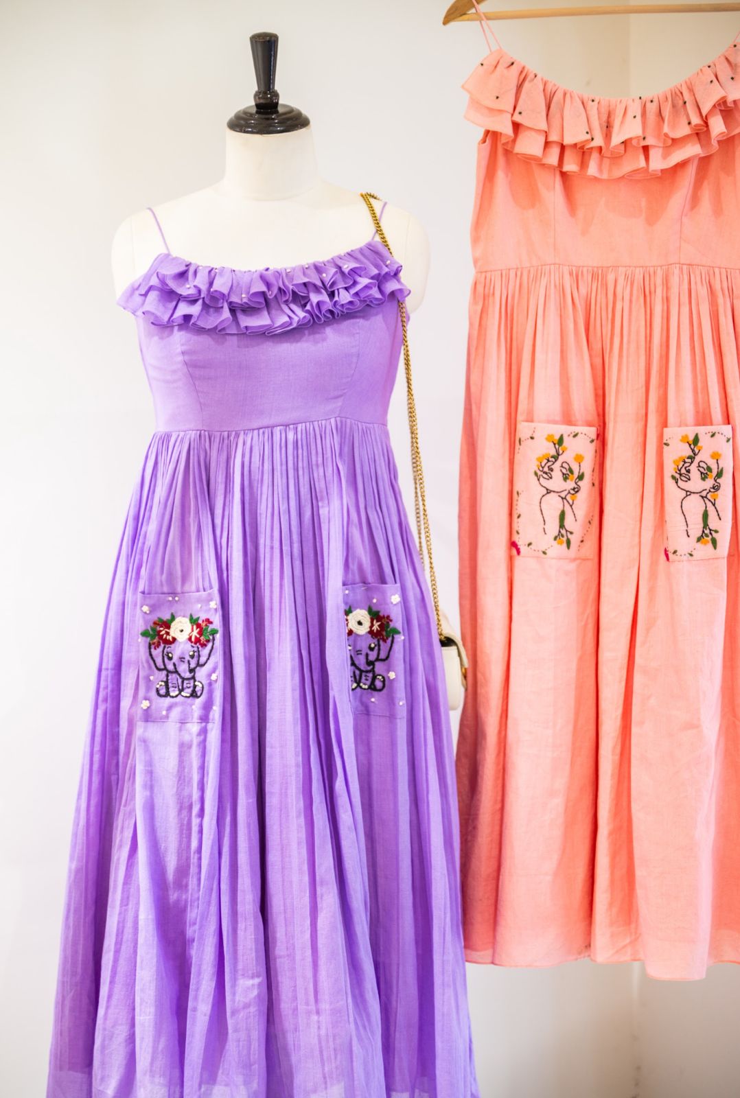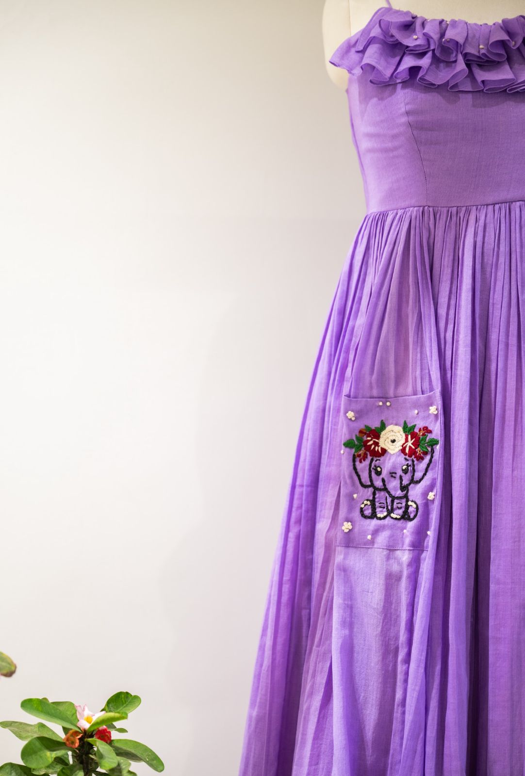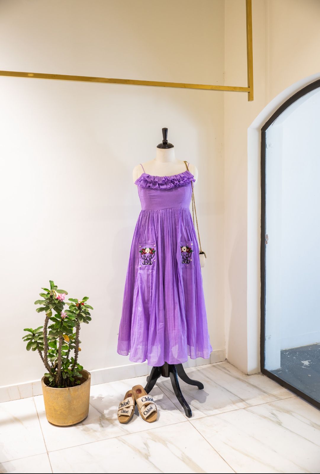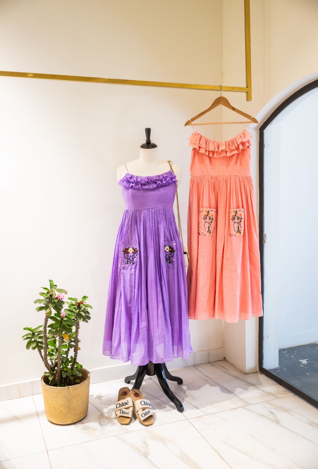Crafted in soft cotton, this lighthearted silhouette is finished with hand-embroidered patch details and playful ruffles at the neckline — a sweet nod to slow, sunlit days.